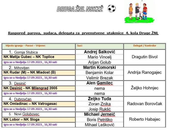 Danas su na rasporedu i utakmice 4. kola 2. zagorske nogometne lige. U 4. kolu Lobor će nakon slobodnog kola dočekati Slogu, u nadi da može nastaviti niz pobjeda. Domaću pobjedu tražit će i Matija Gubec protiv Toplica, a zanimljivo bi moglo biti u Mihovljanu, gdje Rudar dočekuje Mladost Belec. Zahuktali Vatrogasac gostuje kod Omladinca, a Desinić dočekuje Milengrad 2005. Slobodan je Đalski. Utakmice se igraju u 16.30 sati.