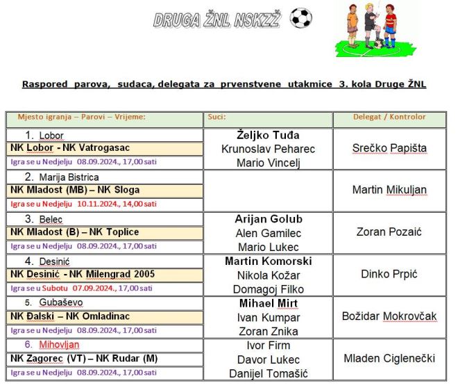 Treće kolo 2. zagorske lige počinje već danas. U Desiniću istoimeni domaćin dočekuje Milengrad 2005. Sutra u Velikom Trgovišću Zagorec će dočekati Rudar Mihovljan, u Novom Golubovcu Lobor čeka Vatrogasac, a u Belcu Mladost je domaćin Toplicama. Utakmica Mladost MB – Sloga je odgođena za 10. studeni. Sve utakmice počinju u 17 sati.