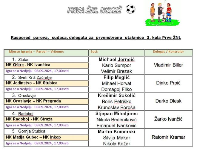 Sutra se igra treće kolo 1. zagorske nogometne lige, koje donosi jedan pravi susjedski derbi. Naime u Zlataru Oštrc dočekuje Ivančicu. Derbi se igra u Svetom Križu Začretju, gdje će Jedinstvo ugostiti Stubicu, a također vrlo zanimljivo trebalo bi biti u Oroslavju gdje gostuje Pregrada. Radoboj će biti domaćin Straži, a Matija Gubec dočekuje Inkop, što je također derbi, jer se sastaju druga i treća ekipa s ljestvice. Utakmice se igraju sutra u 17 sati.