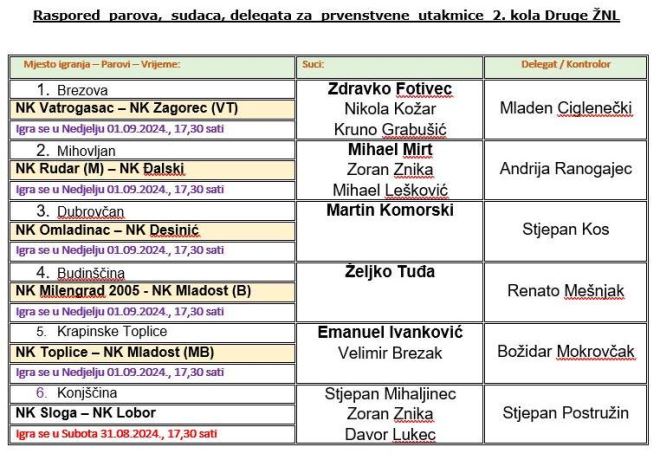 Već danas nastavlja se 2. zagorska liga. U 2. kolu kao vrlo zanimljiva utakmica čini se ona u Brezovi, gdje Vatrogasac dočekuje Zagorec VT. Rudar M će biti domaćin Đalskom, dok će Omladinac dočekati Desinić. U Budinščini se sastaju Milengrad 2005. i Mladost Belec, Toplice su domaćin Mladosti MB, dok će Sloga odigrati i drugu domaću utakmicu zaredom, ovaj puta protiv Lobora. Utakmica u Konjščini igra se danas a sve ostale sutra, s početkom u 17.30 sati.