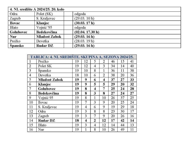 Pred nama je i 20. kolo 4. NL središte – skupina A. Ovo kolo donosi jedna zagorski derbi. Naime, Golubovec dočekuje Bedekovčinu. Riječ je i o ''susjedima'' na ljestvici, jer Golubovec je sedmi sa 28, a Bedekovčina sa 27 bodova drži osmo mjesto. No, s obzirom na loše vrijeme, utakmica je zakazana za srijedu 2. travnja u 17.30 sati
