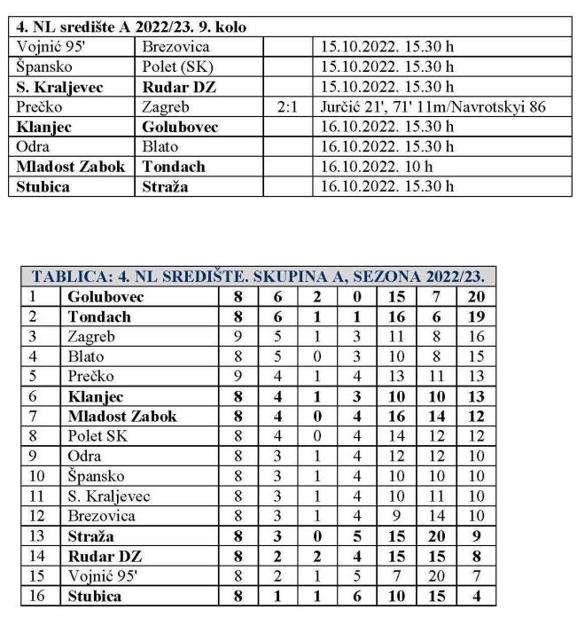 Pred nama je 9. kolo 4. NL središte skupina A. U ovom kolu na rasporedu su čak tri zagorska derbija i to sva tri sutra. Već u 10 sati Mladost Zabok dočekat će Tondach, a u popodnevnom terminu, od 15.30 sati sastaju se Klanjec – Golubovec i Stubica – Straža. Tako je Rudar DZ jedina zagorska ekipa, koja će u devetom kolu igrati protiv ne-zagorske ekipe. Rudar DZ će danas u 15.30 sati gostovati kod Sesvetskog Kraljevca. Inače, kolo su jučer otvorili otvoriti Prečko i Zagreb, i to pobjedom Prečkog 2:1. Danas će igrati Vojnić 95' – Brezovica i Špansko – Polet (SK), a sutra Odra – Blato.