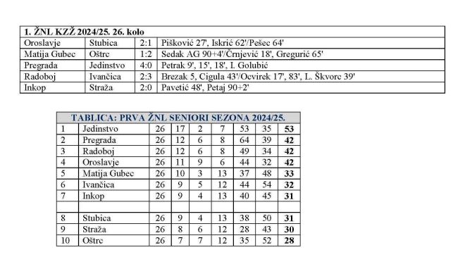 Odigrano je 26. kolo 1. zagorske nogometne lige. U derbiju Pregrada je sa 4:0 svladala opušteno Jedinstvo koje već odavno slavi naslov. Razlika je i dalje 11 bodova. Sada je Pregrada druga, Radoboj treći, a Oroslavje četvrto svi sa 42 boda. Radoboj je u ovom kolu poražen 2:3 od Ivančice, dok je Oroslavje sa 2:1 pobijedilo Stubicu. Do vrlo važne pobjede stigao je Oštrc 2:1 kod Matije Gupca, kao i Inkop koji je sa 2:0 svladao Stražu. Iza Oroslavje su spašeni Matija Gubec sa 33 i Ivančica sa 32 boda. Inkop i Stubica imaju po 31 bod, Straža 30, a Oštrc 28. U zadnjem kolu fešta je u Svetom Križu Začretju, gdje će prvak Jedinstvo dočekati Oroslavje i to već u subotu. U Humu na Sutli Straža dočekuje Radoboj i ako izgubi, mora se pouzdati u Pregradu, koja gostuje kod Oštrca, koji pak mora pobijediti i nadati se da Straža neće pobijediti. Stubica pak dočekuje Inkop, i sa bodom i jedni i drugi sigurno ostaju. Ali Inkop izgubi ima slabiji omjer od Oštrca, a Stubica bolji. Utakmicu za prestiž igraju Ivančica i Matija Gubec. U nedjelju su utakmice na rasporedu u 18 sati.