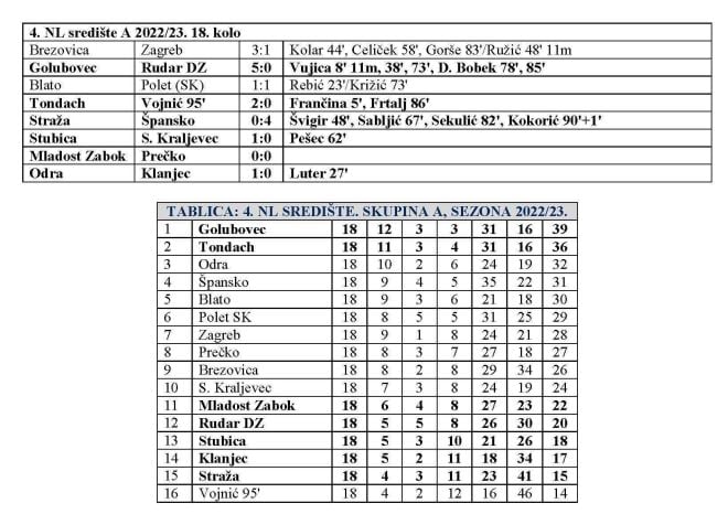 Danas su odigrane preostale četiri utakmice 4. NL središte – skupina A. U zagorskom derbiju Golubovec je sa 5:0 pobijedio Rudar DZ, uz tri gola Vujice i dva Darija Bobeka. Ovom pobjedom Golubovec se vratio na prvo mjesto, koje je jučer nakratko preuzeo Tondach. U prijepodnevnoj utakmici u Zaboku Mladost i Prečko odigrali su bez golova, a poslijepodne do vrlo važne pobjede stigla je Stubica, koja je sa 1:0 pobijedila Sesvetski Kraljevec. Odra je pak sa 1:0 bila bolja od Klanjca i time je ona prvi pratitelj zagorskog dvojca na vrhu.
