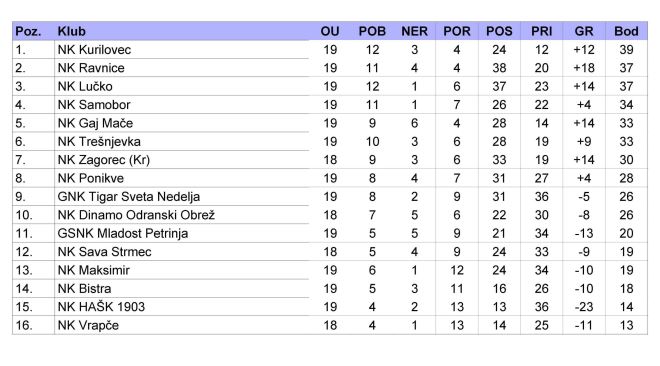 Gaj Mače trenutno drži petu poziciju, dok je Zagorec KR na sedmom mjestu. U idućem kolu Zagorec KR će na svom travnjaku tražiti prvu pobjedu u nastavku prvenstva protiv Maksimira, dok će Gaj gostovati kod Lučkog, jedine momčadi sa stopostnim učinkom u nastavku prvenstva.
