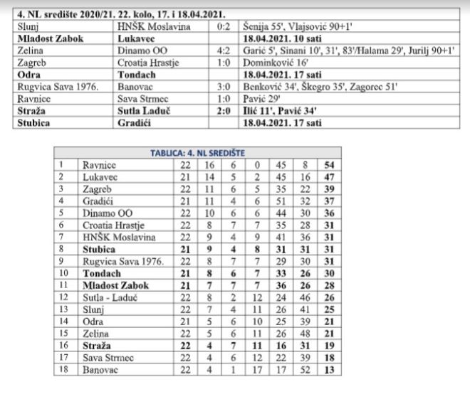 Danas je odigrano 6 utakmica 22. kola 4. NL središte, a od 4 zagorska predstavnika igrala je samo Straža, koja je dočekala Sutlu Laduč. Straža je stigla do vrijedne pobjede, osiguravši ju već u prvih 45 minuta. Za pobjedu su zabila dva Marka. Marko Ilić je već u 11. minuti pogodio za 1:0, da bi Marko Pavić u 34. zabio za, pokazat će se konačnih 2:0. Stražu u srijedu čeka gostovanje kod Gradića, a u subotu će u Pregradi u zagorskom derbiju dočekati Stubicu. U preostalim današnjim utakmicama vodeće Ravnice sa 1:0 su pobijedile Savu Strmec, povećale barem do sutra prednost pred Gradićima, a Savu spustile na predzadnje mjesto, iza Straže, koja se pomaknula za jedno mjesto. Na 3. se probo Zagreb nakon 1:0 protiv Croatie Hrastje. Sutra se igraju još tri utakmice, sve sa zagorskim predstavnicima. Mladost će u Zaboku u 10 sati ugostiti drugoplasirani Lukavec, Stubica je u 17 sati domaćin Gradićima, a Tondach će u 17 gostovati kod Odre. Evo današnjih rezultata, strijelaca i ljestvice.