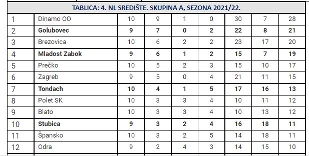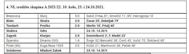 Jučer je odigrano 6 do 8 utakmica 4. NL središte Skupina A, a na terenu su bila i tri zagorska kluba. Zanimljivo je da su sve tri utakmice sa zagorskim dioništvom završila 2:0 za domaćine. Kako je od zagorskih ekipa samo Tondach bio domaćin, jasno je da je samo on jučer stigao do pobjede i to 2:0 protiv visoko plasiranog Prečkog. Utakmicu su Bedekovčanci riješili u prvih 45 minuta nakon dva prekida golovima Merlina i Frtalja. Straža i Klanjec na gostovanjima su doživjelo 0:2 poraze, Straža kod Blata, a Klanjec kod Zagreba. Vodeći Dinamo (OO) jučer je stigao do 9. pobjede zaredom slavivši 4:1 u Španskom. To je ujedno bila jedina gostujuće pojeda jučer, kojom je Dinamo prije današnje dvije utakmice otišao na 7 bodova prednosti pred Golubovcem. Danas nas očekuje veliki zagorski derbi u Novom Golubovcu, gdje Golubovec dočekuje Mladost iz Zaboka. Također igrat će i Stubica, koja dočekuje Odru. Utakmice počinju u 14.30 sati.