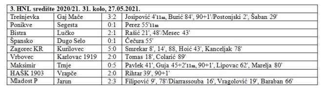 Jučer su odigrane utakmice 31. kola 3. HNL središte. Zagorec je u Krapini io uvjerljiv protiv Kurilovca sa 5:0, pa mu se na 3. mjestu približio na samo 2 boda. Trostruki strijelac bio je Smrekar koji ja zabio prva dva gola za Zagorec, u 8. i 14. minuti, te je završio posao u 88. za konačnih 5:0. Uz njega zabili su još Hoić u 43. i Kanceljak u 78. minuti. Gaj je dva puta vodio kod Trešnjevke, da bi u završnici ostao bez ijednog boda. Već u 2. minuti Postonjski je zabio za 0:1, da bi s bijele točke u 9. minuti izjednačio Josipović. No, Šaban je u 29. minuti ponovno doveo Gaj do vodstva i sa 1:2 se otišlo n odmor. No, Gaj je u završnici pokleknuo. Burić je najprije u 84. minuti izjednačio, da bi u 1. minuti sučeve nadoknade zabio za pobjedu Trešnjevke. Na vrhu je razmak između Jaruna i Trnja ostao isti, 3 boda, i jedni i drugi su pobijedili. U 32. kolu u subotu Zagorec gostuje kod Karlovca, Dok Gaj u nedjelju dočekuje Mladost iz Petrinje. Evo rezultata 31. kola, strijelaca i ljestvice.