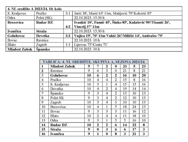 Danas su odigrane četiri utakmice 4. NL središte, skupina A. Igrala su i dva zagorska predstavnika i to s polovičnim uspjehom. Golubovec je stigao do važne pobjede protiv Devetke 3:2. Ovom je pobjedom prekinuo niz od četiri utakmice bez pobjede i stigao na bod Ravnicama, koje sutra gostuju kod Ilovca. Važna bi bila pojeda ili barem bod Rudar DZ Kod Brezovice, u svjetlu borbe za opstanak, no ništa od toga. Iako su ranih 1:0 domaćina brzo okrenuli u 1:2, gosti iz Dubrave Zabočke na kraju su ipak poraženi 2:4 . Tako je Brezovica u dva kola zaredom okretala derbije začelja protiv zagorskih ekipa (nakon Straže u 9. kolu). Danas su još igrali Blato – Zagreb 1:1, dok je Sesvetski Kraljevec pobijedio Prečko 3:1. Sutra već u 10 sati vodeća Mladost Zabok dočekuje Špansko, dok će u isto vrijeme druge Ravnice gostovati kod Ilovca. U 15.30 igrat će sutra još Odra i Polet, a na rasporedu je i zagorski i derbi začelja u kojem, također u 15.30 Ivančica u Zlatar Bistrici dočekuje Stražu.