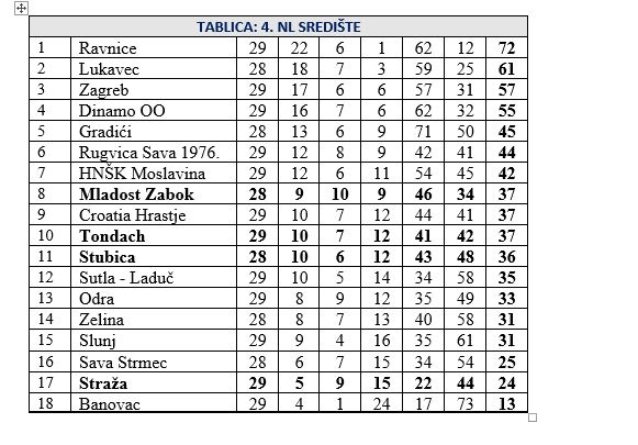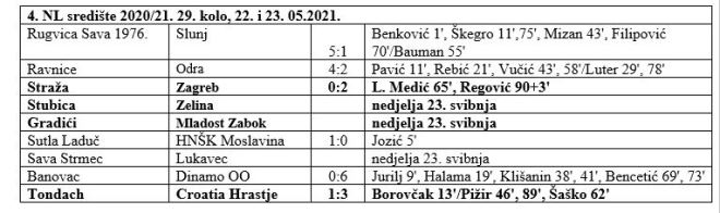 Jučer je odigrano 6 od 9 utakmica 29. kola 4. NL središte. Nastupila su i dva zagorska predstavnika, no oba su doživjeli poraze kod kuće. Tondach je u derbiju sredine ljestvice preko Borovčak poveo protiv Croatije Hrastje, no u nastavku kao da je izašla neka druga momčad, pa su gosti na krilima dvostrukog strijelca, Zagorca Pižira preokrenuli. Straža je pak dočekala Zagreb i pokleknula u nastavku. L. Medić je zabio za vodstvo gostiju u 65. minuti, a u 3. minuti sučeve nadoknade za konačnih 0:2 pogodio je A. Regović. Danas će igrati Stubica, koja dočekuje Zelinu i Mladost Zabok, koja gostuje kod Gradića. U jučerašnjim utakmicama Ravnice su pobijedila Odru sa 4:2 i dalje hitaju prema naslovu, sa samo jednim porazom, i to kod Stubice. Zadnji Banovac je sa 0:6 poražen od Dinama OO i očito je odustao od borbe za opstanak, jer Straža bježi 11 bodova. Danas se igra još jedna utakmica. Sava Strmec dočekuje Lukavec. Prije tri današnje utakmice Mladost je na 8. mjestu sa 37 bodova, koliko ima i 10. Tondach, dok je Stubica 11. sa bodom manje. Evo svih jučerašnjih rezultata, strijelaca i aktualne ljestvice.