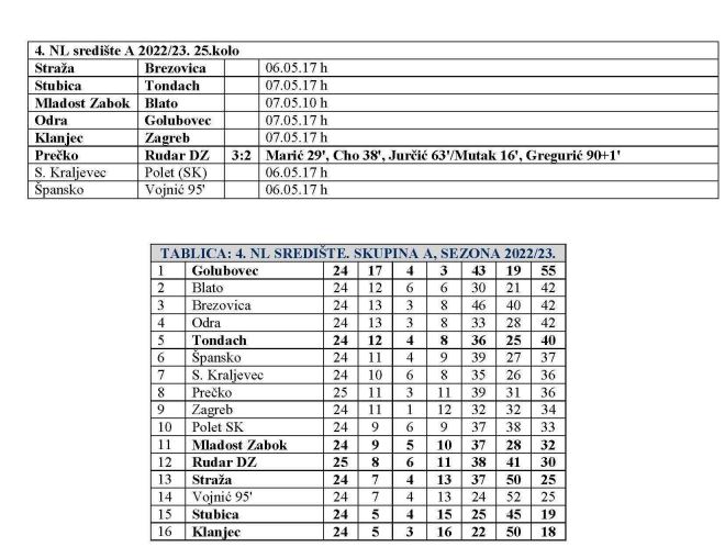 Krenulo je 25. kolo 4. NL središte skupina A. Naime već jučer Rudar DZ je gostovao kod Prečkog. Dobro je krenulo zagorski predstavnik i poveo u 16. minuti, ali je Prečko okrenulo i na kraju slavilo sa 3:2. Ovo kolo donosi jedan zagorski derbi i to u Donjoj Stubici gdje sutra gostuje Tondach. Straža danas dočekuje Brezovicu, a preostala tri zagorska predstavnika igraju sutra. Već od 10 sati Mladost Zabok dočekuje Blato, Klanjec je od 17 sati domaćin Zagrebu, a u isto vrijeme vodeći Golubovec gostuje kod Odre. Evo svih parova i ljestvice.