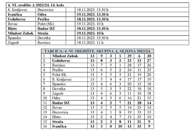 Pred nama je predzadnje jesensko kolo u 4. NL središte skupina A. U 14. kolu na rasporedu je jedan zagorski derbi. Mladost će u Zaboku sutra u 10 sati dočekati Stražu. Danas će na teren dva zagorska predstavnika. Golubovec će u 13.30 sati dočekati Prečko, dok Rudar DZ u isto vrijeme gostuje kod Blata u važnoj utakmici borbe za opstanak. Zadnja će na teren od zagorskih predstavnika u 14. kolu Ivančica, koja će sutra u 13.30 sati dočekati Odru.