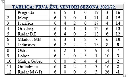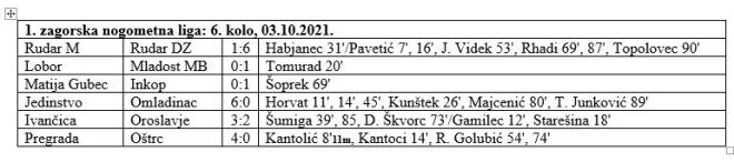 Vodeća Pregrada u 6. kolu 1. zagorske lige nije imala problema sa Oštrcom. Pobjeda od 4:0 zadržala ih je u vodstvu sa 16 bodova, bodom više od Inkopa, koji je sa 1:0 slavio kod Matije Gupca. U ljepotici kola, pa i prvenstva do sada Ivančica je okrenula 0:2 u 3:2 protiv Oroslavja i stigla na 3. mjesto sa 14 bodova, dok je Oroslavje sa prvim porazom sa 2. palo na 4. mjesto sa 13 bodova. Rudar DZ nije imao problema kod imenjaka u Mihovljanu. Slavio je sa 6:1 i zadržao 5. mjesto sa 12 bodova. Mladost MB je stigla do treće uzastopne pobjede, ovaj puta 1:0 kod Lobora, te je i ona zadržala poziciju, i to 6. sa sada 10 bodova. Na 7. mjesto se probilo Jedinstvo nakon 6:0 pobjede protiv Omladinaca i sada ima 8 bodova. Oštrc je pao na 8. mjesto sa 7 bodova, a zadnja četvorka nije mijenjala pozicije. Lobor je 9. sa 3 boda, Matija Gubec i Omladinac imaju po 2, a Rudar M minus 1 bod. U 7. kolu na rasporedu je derbi u Oroslavju, gdje će istoimeni domaćin dočekati Pregradu, a vrlo zanimljivo bit će i u Poznanovcu, gdje Inkop dočekuje Jedinstvo. Ivančica će gostovati kod Omladinca, Oštrc dočekuje Rudar M, Mladost MB je domaćin NK Matija Gubec, a Rudar DZ Loboru. Utakmice se igraju u nedjelju 10. listopada u 16 sati.