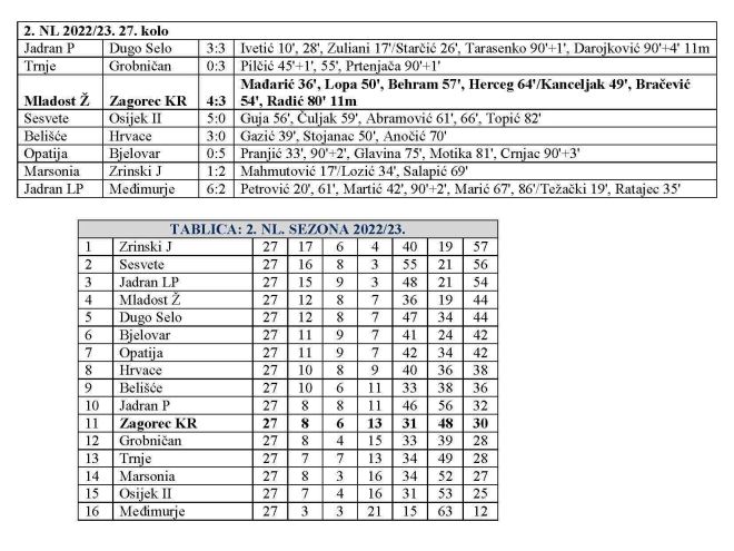 U 27. kolu Druge SuperSport nogometne lige krapinski Zagorec gostovao j e kod Mladosti iz Ždralova i pretrpio poraz od 3:4.