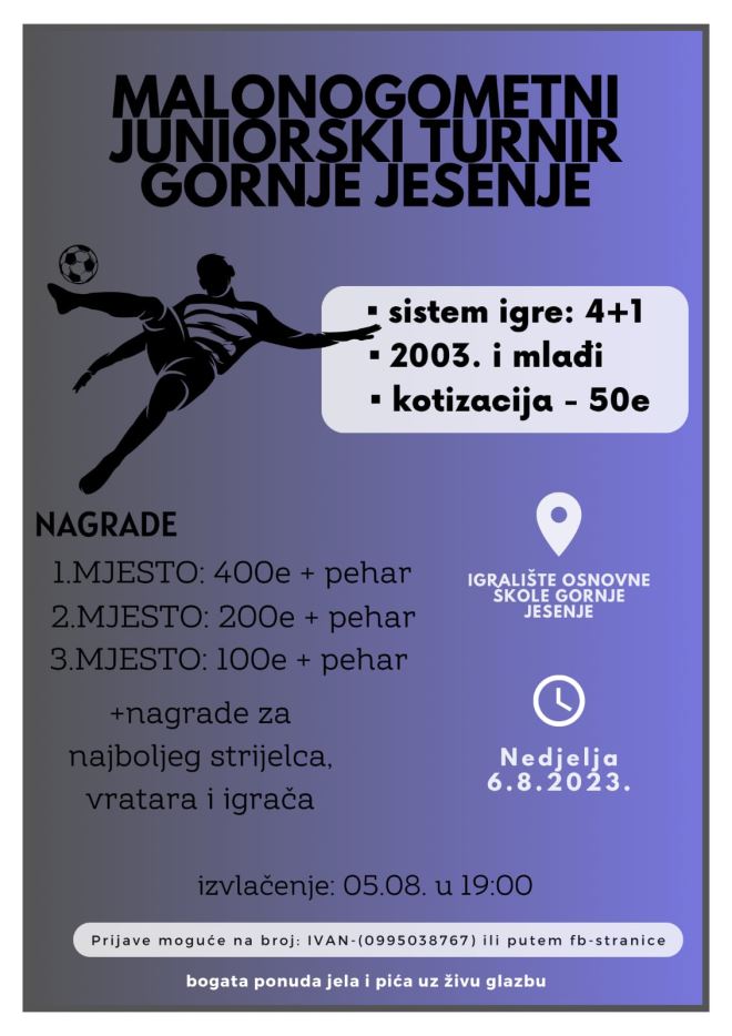 Organizatori pozivaju sve zainteresirane i željne odličnog nogometa i dobre zabave na malonogometni turnir za mlade koji će najvjerojatnije postati tradicionalan, a održat će se na asfaltnom igralištu Osnovne škole Gornje Jesenje.