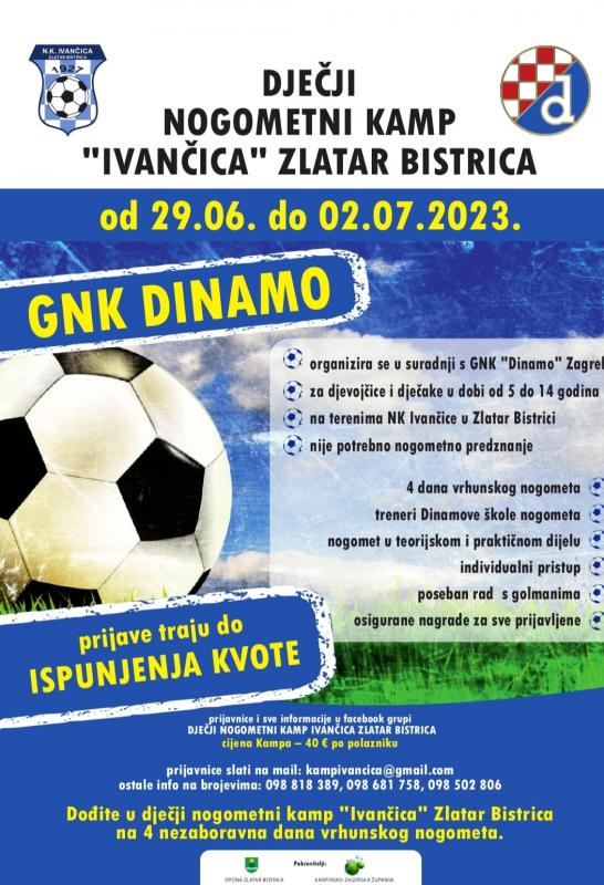 U godini koja će ostati upisana zlatnim slovima u povijest NK Ivančica Zlatar Bistrica, nakon osvojenog naslova u 1. zagorskoj ligi i plasmana u 4. NL središte skupina A, Ivančica i ove godine organizira tradicionalna događaja na početku ljeta. Tako je već u četvrtak 22. lipnja na rasporedu 9. memorijalni turnir Marijan Jurec Šika, za limače i zagiće. Početak je već u 9 sati, a prijave i dodatne informacije moguće je dobiti na 098 721 193, 099 631 2679 i 098 212 475. Također, i dalje traju prijave za 3. Dječji nogometni kamp koji zlatarbistrička Ivančica organizira u suradnji s Dinamovom školom nogometa, a održat će se od 29. lipnja do 2. srpnja na nogometnim terenima u Zlatar Bistrici. Sudjelovati mogu djevojčice i dječaci u dobi od 5 do 14 godina, nogometno predznanje nije potrebno. Očekuju ih četiri dana vrhunskog nogometa s Dinamovim trenerima u teorijskom i praktičnom obliku, uz individualni pristup i poseban rad s golmanima te osigurane nagrade za sve prijavljene. Cijena kampa je 40 eura po polazniku. Prijave se primaju do popunjenja kvote i šalju se mailom na [email protected],