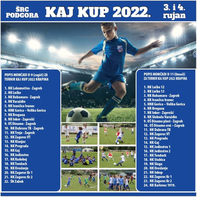 U Krapini, na terenima ŠRC Podgora, u organizaciji NK Zagorec Krapina, omladinska škola, održati će se „Kaj kup 2022.“ za zagiće i limače ovog vikenda, 3.-og i 4.-og rujna. Na kupu će nastupiti 46 ekipa -22 zagića i 24 limača – što je više negoli zadovoljavajuće.