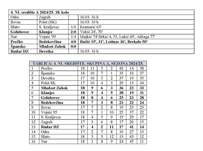 Odigrane su danas četiri utakmice 18. kola 4. NL središte – skupina A. I ovo je kolo donijelo jedan zagorski derbi. Golubovec je pobijedio Klanjec 2:0, uz dva gola Vukića. Mladost Zabok je odigrala 0:0 kod, do jučer vodećeg Španskog, koje je sada palo na drugo mjesto. Još jučer Bedekovčina je gostovala kod Prečkog, koje je slavilo sa 4:0.