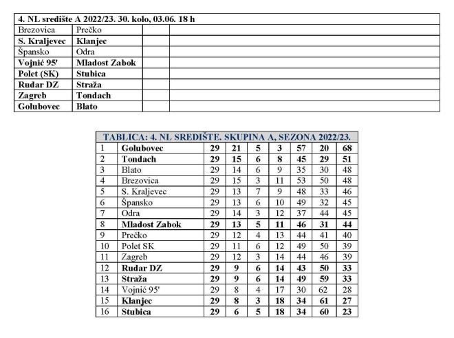 Danas je na rasporedu zadnje, 30. kolo 4. NL središte skupina A. Prvak je odavno poznat, a proslava u Novom Golubovcu danas počinje od 17 sati, utakmica protiv Blata od 18 sati. Drugo mjesto osigurao je Tondach, a u zadnjem kolu danas gostuje kod Zagreba. Zagorski derbi u Dubravi Zabočkoj igrat će Rudar DZ i Straža, ujedno je to borba za 12. mjesto. Stubica će za oproštaj od lige gostovati kod Poleta (SK). A ostanku se još uvijek nada Klanjec. Iako postoje raspleti, po kojima bi i sa predzadnjeg mjesta mogao ostati u ligi, postoje i oni po kojima ni 14. mjesto nije dovoljno. No, malo će više biti poznato nakon današnjih utakmica u 2. SuperSport i 3. NL centar. No, na Klanjčanima je da pokušaju svakako stići do 14. mjesta, a tu trebaju i pomoć Mladosti iz Zaboka. Naime, Mladost gostuje kod Vojnića '95, koji Klanjcu bježi bod. Klanjec ima bolji međusobni omjer od Vojnića '95, tako bi mu i bod bi dovoljan ako Vojnić izgubi. No, ni do nove neće biti nimalo lako doći, jer Klanjec gostuje kod Sesvetskog Kraljevca. Sve utakmice počinju u 18 sati.