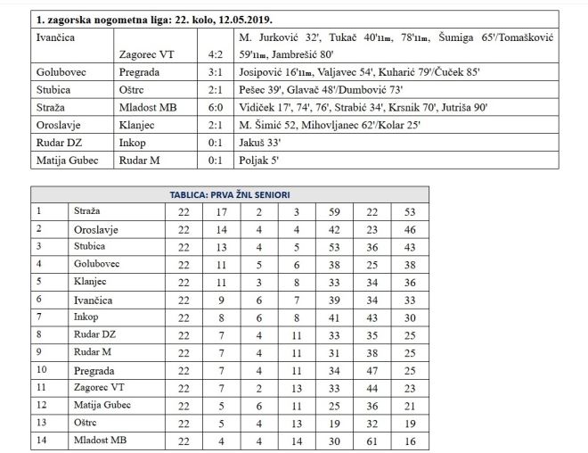 Rezultati prve i druge zagorske nogometne lige Autor: zagorje.com 12 svibnja, 2019. 20:55 Donosimo rezultate odigranih utakmica ispis Tweet Share on Facebook Plus on Google+