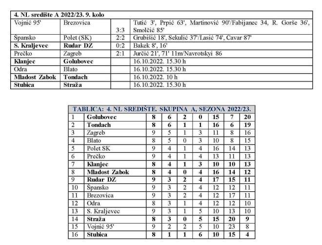 U 9. kolu 4. NL središte skupina A Rudar DZ je gostovao kod Sesvetskog Kraljevca. Kako prvenstvo odmiče, Rudar DZ sakuplja sve više bodova, ali do ovog kola svih osam bodova osvojeno je na domaćem terenu. No, tradicije su da se ruše, pogotovo one sitne statističke u tekućem natjecanju. U taboru Rudara optimistični prije početka, jer teren je sa umjetnom travom, a trener Mario Videk ističe kako ovakvoj mladoj poletnoj ekipi, a taktički izvrsnoj takav teren može biti samo forte, a nikako minus. A da optimizam nije bez pokrića pokazuje već sam početak, jer već u prvoj minuti Florian Videk probija desnu stranu i ubacuje na kapetana Tomislava Valaškog, koji pogađa stativu. Gosti ne razmišljaju o propuštenom, postavljeni u tri bloka, prepuštaju laganu inicijativu domaćinima, ali su u svojim napadima opasni, posebice preko desne strane. Tako već u osmoj minuti opet F. Videk odigrava dupli pas sa Mouhcine Rhadijem i ponovno sjajno daje povratnu na nekih 15 metara, gdje Dorijan Bakek prima loptu i pogađa drugi kud domaćeg golmana Ivana Jurića-Barea za 0:1. I nakon vodstva Rudar DZ nastavlja po svom dobitnom obrascu, strpljivo i sigurno otraga, ubojito prema naprijed. I već u 16. minuti je 0:2. Karlo Krznar daje desno za F. Videka, ovaj neumorno probija desnu stranu, ubacuje za Bakeka, koji je i drugi puta precizan, ovaj puta u prvi kut za već 0:2. Domaćinima ostaje inicijativa blaga, ali bez konkretnih prigoda, dok je na drugoj strani do odmora prednost mogla biti i veća. U 36. minuti opet F. Videk ubacuje s desne strane, a Jakov Videk sa 16 metara pogađa jednog domaćeg igrača na zemlji. U 41. minuti F. Videk nalazi Rhadia na 2 metar pred golom, a ovaj puca glavom preko gola. Na otvaranju nastavak domaćini imaju priliku za povratak. Nakon jedne duge lopte Mateo Šušak neoprezno starta na jednog domaćeg igrača i to je kazneni udarac za Sesvetski Kraljevec. No, svoj obol daje i mladi golman Fran Gelo koji brani udarac Ivanu Zečeviću. Nakon toga nastavlja se kontrola gostiju, koji uz dobar blok prijete iz kontri i polukontri. Izvrsni F. Videk tako u jednoj prigodi daje u sredinu za Karla Tisanića, koji slabo reagira, nakon toga dobra akcija na desnoj strani i opet ubacivanje na Tisanića, koji je ovaj puta melo kratak, a u samoj završnici priliku ima i Dominik Cujzek, ali puca malo pored gola. Rudar DZ je prva ekipa koja je odnijela sva tri boda s ovog terena. Do sada je jedino vodeći Golubovec uzeo bod, a npr. jedini poraz drugog Tondacha do ovog kola bio je baš u Sesvetskom Kraljevcu, što dodatno daje na vrijednosti ovoj pobjedi Rudara DZ, koji u 10. kolu u nedjelju 23. listopada dočekuje Prečko.