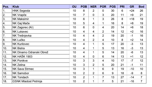 Zagorski klubovi u III. NL-centar od mogućih devet osvojili su tri boda u 10. kolu. Zahvaljujući pogtku Ristovskog Gaj je osjetio slast pobjedu u Odranskom Obrežu i probio se već na četvrto mjesto na ljestvici. Šokanatan domaći porazo od Ponikvi spustio je Zagorec KR na petu poziciju. Tondach nastavlja s porazima, ovaj puta bolja je bila Zelina na svom travnjaku. U derbiju kola Vrapče je nadigralo Lučko i tako zadržalo drugu poziciju. U sisačko-moslavačkom derbiju Segesta je teže od očekivnog slavila protiv Mladosti i zadržala vodeću poziciju, dok su u "samoborskom derbiju" Samobor i Sava podijelili bodove. Maksimir je "petardom" protiv Karlovca potvrdio treću poziciju, a vrlo važnu pobjedu ostvarila je Bistra protiv HAŠK-a. Mreže su mirovale jedino u Lukavcu gdje je domaćin dočekao Trešnjevku.