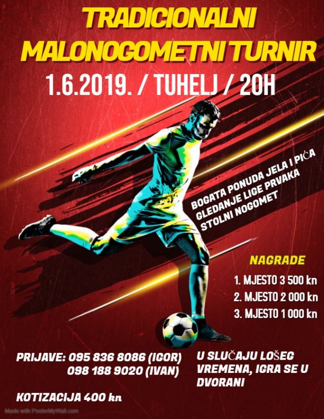 Kaj veliš? Nebuš došo jer se igra finale Lige Prvaka? Ma daaaaj buraz... Kad vidiš kakav smo ekran postavili, mislil budeš da si u Madridu. Nakon kaj si spiješ 5-6 Žujih, tekmu budeš gledal i u 3D-u. Još vas nismo uvjerili? A kaj ak velimo da smo nabavili stolni nogomet. 1 vs 1, 2 vs 2... Kad poželiš frenda oderati za rundu lijepo ga izazovi na jednu partiju, pa da vidimo ko bu pil a ko bu plaćal. Nagrade su parekselans, a osim ovih novčanih, imamo i one za najboljeg igrača i golmana. Tak da dragi naši, vidimo se 1.6. u Tuhlju. Fudbalica, pivica, klopica i uživancija. Nema spasa – napisali su organizatori.