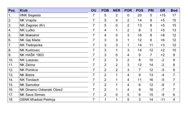 Iz kola u kolo sve bolja Trešnjevka slavila je protiv Zagorca KR i tako izazvala promjenu na vrhu nakon što Segesta jednim pogotkom došla do sva tri boda kod HAŠK-a. Siščani su lider, dok su Krapinčani pali na treće mjesto. Prestiglo ih je i Vrapče nakon gostujuće pobjede protiv Mladosti u Petrinji. Dobar posao ovaj tjedan napravio je Gaj. Prvo je u srijedu u zaostaloj utakmici 6. kola savladao Mladost, a potom je u gostima kod Ponikvi osvojio bod u utakmici bez golova i tako se smjestio na šestu poziciju. Tondach je uvjerljivo poražen u gostima kod Maksimira. Lučko je propustilo veliku priliku da se popne na drugo mjesto nakon poraza u Kurilovcu. Bistra je u derbiju začelja postigla vrijednu pobjedu protiv Dinama OO, dok je Sava Strmec "fenjer" prepustila Mladosti nakon pobjede protiv Zeline.