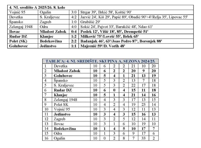 Odigrano je i 10. kolo u 4. NL središte skupina A, koje je ponudilo dva zagorska derbija. U subotu su Golubovec i Jedinstvo odigrali 1:1, čime je Golubovec izgubio prvo mjesto. U nedjelju je pak Klanjec u gostima svladao Rudar DZ sa 2:1. Osim ova dva zagorska derbija, Mladost Zabok je sa 4:0 slabila kod Ilovca i sada je su-vodeća sa 18 bodova. Bedekovčina je odigrala 2:2 kod Poleta (SK) i to povratkom u samoj završnici sa igračem manje. Time se popela na 14 mjesto sa sedam bodova. Na vrhu je i dalje velika gužva. Čak šest ekipe je u dva boda razlike. Devetka i Mladost Zabok imaju po 20, Golubovec 19, a Špansko, Sesvetski Kraljevec i Rudar DZ po 18 bodova. Sedmi je Klanjec sa 16 bodova, Jedinstvo je na 11. mjestu sa 13 bodova. Pred nama je 11. kolo, opet sa dva zagorska derbija. Već u petak kolo otvara gradski derbi. Naime, Mladost Zabok dočekuje Rudar DZ. Sve ostale utakmice igraju se u nedjelju 2. studenoga. U još jednom zagorskom derbiju Bedekovčina dočekuje Golubovec u 14.30 sati. U isto vrijeme Jedinstvo je domaćin Vojniću '95, a Klanjec Poletu (SK). Također u tom nedjeljnom terminu Zagreb dočekuje Zelengaj 1948., Sesvetski Kraljevec Špansko, a Ogulin Devetku, dok će u 17 sati igrati Odra i Ilovac.