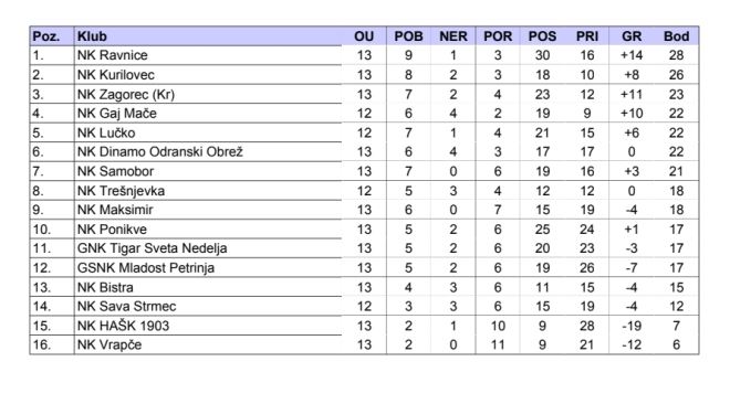 Ovoga je vikenda na rasporedu 13. kolo u 3. NL centar. Šest utakmica odigrano je danas, a vijest dana stiže iz Zagreba, gdje je odlični Zagorec KR srušio vodeće Ravnice sa 2:0. Karlo Stiperski doveo je Zagorec u goste u 36. minuti, a pobjedu je osigurao Petar Šimunić u 87. minuti. Ravnice su ostale na vrhu sa 28 bodova, jer je Kurilovec poražen kod kuće od Dinama (OO) sa 1:2 i ostao je drugi sa 26 bodova, a Zagorec je stigao na treće mjesto sa 23 boda. Gaj Mače Lučko i Dinamo (OO) imaju po 22 boda, ali Gaj i Lučko utakmicu manje. Naime, Gaj igra sutra u 11.30 u Maču protiv Trešnjevke, dok je utakmica Lučko – Sava Strmec odgođena za 4. prosinca.