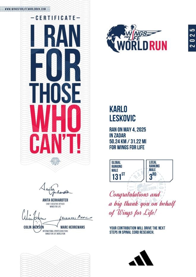 Sjajni Karlo Lešković, atletičar AK Zabok, ostvario je odličan rezultat na poznatoj svjetskoj utrci „Wings for life“ koja se tradicionalno održava u Zadru. Karlo je uspio pretrčati 50,24 kilometara što mu je donijelo ukupno treće mjesto u konkurenciji 10.000 trkača u Zadru. Karlo je ujedno imao 131 vrijeme od seniora na svijetu, što je izniman uspjeh, ako se zna da je u ovoj utrci nastupilo oko 200.000 natjecatelja u cijelom svijetu. Bolji od Karla bili su samo Poljaci Slawomir Kaliski koji je bio pobjednik s 55.07 pretrčanih kilometara i Pawel Szymanski koji je pretrčao 50.73 kilometara.