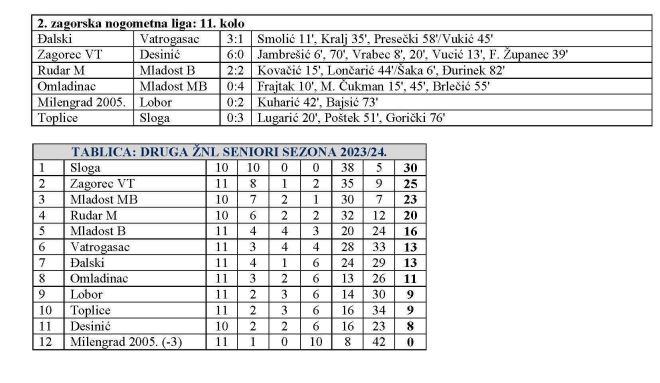 Odigrano je i 11. kolo 2. zagorske nogometne lige, posljednje po rasporedu ove jesni, no ostale su još dvije zaostale utakmice. Vodeća Sloga je sa 3:0 slavila kod Toplica, pa je i dalje na savršenom učinku sa 30 bodova iz deset utakmica. Zagorec VT je sa 6:0 svladao Desinić i drži drugo mjesto sa 25 bodova, dakle pet manje, ali i sa utakmicom više od Sloge. Mladost MB je sa 4:0 slavila kod Omladinca i drži treće mjesto sa 23 boda, iz deset utakmica. Rudar M je odigrao 2:2 doma protiv Mladosti iz Belca i na četvrtom mjestu ima 20 bodova, također sa još jednom utakmicom za odigrati. Mladost B je na petom mjestu sa 16 bodova. Đalski je sa 3:1 pobijedio Vatrogasac, koji je na šestom mjestu sa 13 bodova, koliko sada ima i sedmi Đalski. Omladinac drži osmo mjesto sa 11 bodova, a nakon pobjede 2:0 u derbiju začelja kod Milengrad 2005., Lobor se popeo na deveto mjesto sa devet bodova. Isti broj bodova imaju i Toplice na desetom mjestu, dok je Desinić pao na 11. mjesto sa osam bodova. Na samom dnu je Milengrad 2005. bez bodova. Sada su još dvije preostale zaostale utakmice. U Mariji Bistrici Mladost MB dočekuje vodeću Slogu, u utakmici u kojoj Sloga traži i 11. pobjedu, kojom bi napravila veliki korak prema naslovu, već nakon pola sezone. U Desiniću će pak Desinić dočekati Rudar Mihovljan.