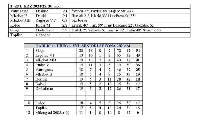 Odigrano je 20. kolo 2. zagorske nogometne lige. Otvorili su ga Sloga i Omladinac još u subotu. Sloga je stigla do pobjede 5:0 kojom se približila naslovu. Preostaje joj u zadnjem kolu dobiti Toplice, jer je u predzadnjem slobodna. Ako izgube, vreba Zagorec VT koji je u ovom kolu dobio bez borbe Mladost MB. Bistričanci opterećeni ozljedama nisu skupili ekipu, i do kraja će im pomoći kadeti da odrade još dva kola. Zagorec ima 49 bodova, Mladost na trećem mjestu 41, a Rudar M nakon 2:2 kod Lobora na petom mjestu ima 36 bodova. Vatrogasac je sa 2:1 pobijedio Desinić i sada na petom mjestu ima 25 bodova. Mladost B je sa 2:1 svladala Đalski pa se probila na šesto mjesto sa 19 bodova. Sedmi je Desinić sa 18, a po 17 imaju Đalski, Omladinac i Lobor. Toplice su na 11. mjestu sa 13 bodova. U 21. predzadnjem kolu vodeća Sloga je slobodna. Derbi je u Mihovljanu, gdje Rudar dočekuje Mladost MB. Opet je dvostruki program u Velikom Trgovišću, gdje prvo u 17.30 Zagorec dočekuje Mladost iz Belca, a u 20 sati Omladinac je domaćin Loboru. Još će igrati Toplice – Vatrogasac i Đalski – Desinić. Ima još i zaostalih utakmica.