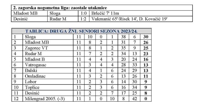 Odigrane su dvije zaostale utakmice 2. zagorske nogometne lige. Sloga, koja je u deset utakmica upisala deset pobjeda, gostovala je u Mariji Bistrici. Pobjedom bi ekipa iz Konjščina, osim savršenog jesenskog učinka, praktički pirom otvorila vrata 1. zagorskoj ligi. No, u tvrdoj utakmici, u kojoj je Sloga imala posjed, ali igrala sa previše nervoze, često se nepotrebno okrećući sucu utakmice, Mladost je rano vodstvo iz penala zadržala do kraja i tako, koliko toliko učinila proljeće zanimljivijim po pitanju naslova. No, Sloga sa 30 bodova, četiri više od Mladosti, sasvim zasluženo uzima jesenski naslov i sve drži u svojim rukama. U jesen je pokazala da teško prosipa bodove, u proljeće na svom terenu čeka i Mladost MB koja zaostaje četiri boda i Zagorec VT koji je iza pet bodova. No, naravno legitimno je da se i pratitelji nadaju da mogu sustići vodećeg, a ako ne onda im ostaje borba za drugo mjesto, koje u nekim scenarijima, koji su vezani za više lige, također može donijeti plasman u Prvu zagorsku ligu. U tu borbu se uključio i Rudar Mihovljan, koji je u zaostaloj utakmici 1. kola slavio kod Desinića 2:1 i sada je četvrti sa 23 boda. Ostatak lige dosta zaostaje, Mladost B je na petom mjestu sa 16 bodova, šesti Vatrogasac i sedmi Đalski imaju po 13, a osmi Omladinac 11 bodova. Slijede Lobor i Toplice sa po devet bodova, na 11. mjestu je Desinić sa 8, a na samom dnu Milengrad 2005. bez bodova. Listu strijelaca predvodi iskusni igrač – trener u Mladosti MB Mario Brlečić sa 17 golova, a drugi je Nikola Latin iz Sloge sa 12 golova.