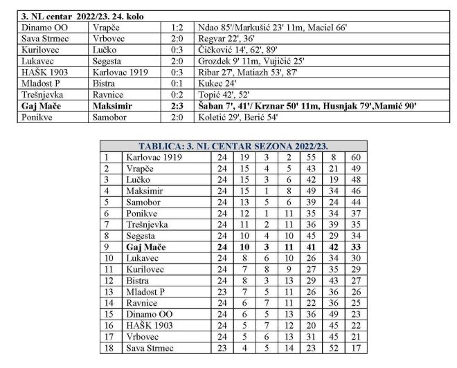 Gaj Mače danas je u 24. kolu 3. NL centar dočekao Maksimir i odigrao šokantnu utakmicu. Naime, već u trećoj minuti Maksimir je ostao sa igračem manje. Vide Sečenj zaradio je izravni crveni karton zbog povlačenja za dres Luke Gajskog. Bila je to jedna greška gostiju, lopta je stigla do Gajskog, koji se spustio prema golu i Sečenj ga povlači u gol šansi i Gaj dobiva priliku 11 na 10. Gaj je prednost igrača viška vrlo brzo pretočio u vodstvo. Naime, Martin Šaban je u 7. minuti zabio za 1:0. No, do odmora mogao je Gaj (i trebao) napuniti mrežu Maksimira do vrha. Najbolju priliku imao je Šaban, nakon povratne lopte od strane Dina Cvrtile, no sa pet metara pogodio je točnu u, inače sjajnog golmana Petra Kezerića. Kezerić je sjajno izvadio i jako nezgodnu loptu, koja se od živog zida odbila i promijenila smjer. Bila je riječ o slobodnjaku Tina Gregurića, koji je uz to pogodio i prečku. Ipak, u 41. minuti Gaj dolazi do 2:0. Šaban se sjajno snašao, nakon jedne odbijene lopte i zabio za 2:0 Reklo bi se idealno i sve je ukazivalo na pobjedu domaćina, iako se domaćini sigurno žalili da još koja lopta nije ušla u gol u prvih 45 minuta. No, u nastavku preokret. Već u 49. minuti situacija koja je utjecala na nastavak i odnijela vodu na mlin gostiju. Nakon duge lopte preko obrane domaćina i ulaska s krila jednog igrača, Mislav Janko Tor izlazi na njega, ovaj daje povratnu i uslijedio je udarac. Do gol crte je stigao Tomas Vukadin i instinktivno brani rukom. Zaradio je izravan crveni karton, pa su snage poravnate, a naravno Maksimir je dobio kazneni udarac, koji je u 2:1 u 50. minuti pretvorio Stjepan Krznar. Nakon toga Gaj se povlači, a gosti su osjetili da mogu do punog plijena. U 79. minuti Robert Husnjak nakon pogađa za 2:2. No, u 82. minuti Gaj ima veliku šansu vratiti vodstvo. Dino Postonjski krenuo je od svoje polovice u kontru, na centru se othrvao stoperu a uz njega trči i Šaban. Sve izgleda čisto, no Postonjski malo krivo zahvaća loptu i ona odlazi predaleko od Šabana, koji ju nekako hvata i pokušava natrag za Postonjskog, no obrana se već vratila i prilika propada. I kada se već činilo da će utakmica završiti podjelom bodova, u 90. minuti Filip Mamić pogađa za konačnih 2:3 i pobjedu Maksimira. Ušao je s lijeve strane u kazneni prostor, namjestio se i pogodio desnom nogom prvi kut za 2:3. Mora se reći da je Gaj odigrao vidno oslabljen, bez nekolicine standardnih igrača (Mazalović, Haramustek, Brlečić, Sambol…). No, i takav je mogao doći do pobjede protiv top pet ekipe lige trenutno, ali na kraju nije tako ispalo. U 25. kolu Gaj gostuje kod Samobora.