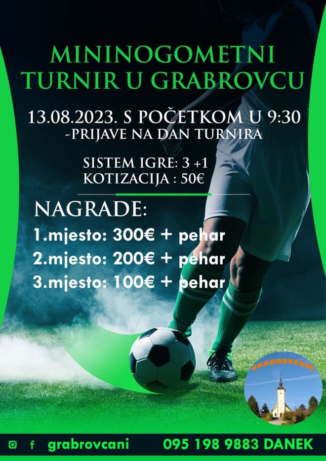Tradicionalni malonogometni turnir u Grabrovcu (Zabok) održat će se 13. kolovoza 2023. godine s početkom u 7 sati.