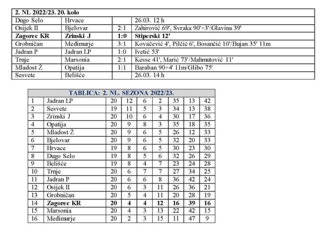 Igrači Zagorca desetkovani virozom i oslabljeni ne igranjem Harrisona uspjeli su protiv favoriziranog Zrinskog upisati vrlo važna tri boda, Jedini pogodak u 12. minuti postigao je mladi Stiperski nakon odličnog dodavanja Krznarića. Od 35. minute Zagorec je igrao sa igračem manje jer je isključen Čondrić ali igrači Zagorca uspjeli su odoljeti svim pokušajima gosta da dođe do izjednačenja.