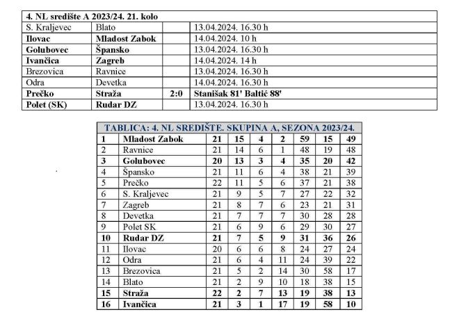 Već je krenulo 22. kolo 4. NL središte, skupina A. Naime, Prečko redovno domaće utakmice igra petkom, a jučer je dočekao Stražu. Prečko je slavilo sa 2:0, no Straža je držala bod sve do same završnice, jer su golovi pali u 81. i 88 minuti. Ostale utakmice igraju se danas i sutra. U 16.30 sati Golubovec dočekuje Špansko, a Rudar DZ gostuje kod Poleta u Svetoj Klari. Sutra u 10 sati Mladost Zabok će u goste Ilovcu, dok će kolo zatvoriti, od zagorskih klubova Ivančica, koja sutra u 14 sati dočekuje Zagreb. Danas će još Sesvetski Kraljevec dočekati Blato, a Brezovica Ravnice, dok će sutra u 16.30 sati Odra biti domaćin Devetki.
