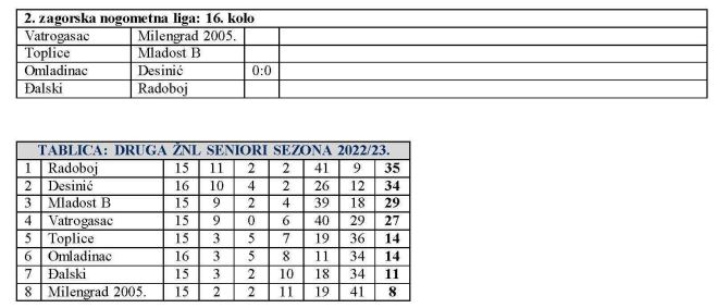I u 2. zagorskoj ligi na rasporedu je 16. kolo, a jedna utakmica je već odigrana. Jučer su Omladinac i Desinić igrali bez golova. Preostale tri utakmice igraju se danas od 17 sati. Vodeći Radoboj gostuje kod Đalskog, Mladost B kod Toplica, a Vatrogasac dočekuje zadnji Milengrad 2005.