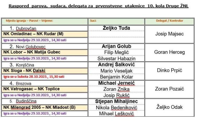 U 2. zagorskoj ligi 10. kolo već danas u 15.30 sati otvorit će Sloga i Đalski, a ostale utakmice igraju se sura u 14.30 sati. Vodeći Vatrogasac dočekat će Toplice, a derbi se igra u Novom Golubovcu, gdje Lobor dočekuje Matija Gubec. Mladost B gostuje kod Milengrada 2005., a Rudar M kod Omladinca. Slobodan je Desinić.