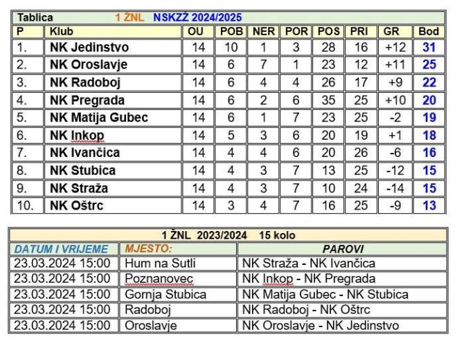 Sutra je na rasporedu 15. kolo 1. zagorske nogometne lige. Na rasporedu je veliki derbi, utakmica u kojoj drugo Oroslavje dočekuje vodeće Jedinstvo. Na rasporedu je i vječni stubički derbi u kojem Matija Gubec dočekuje Stubicu. Straža će u drugoj uzastopnoj domaćoj utakmici dočekati Ivančicu, a Inkop je domaćin Pregradi. Radoboj dočekuje Oštrc, a sve se utakmice igraju sutra u 15.30 sati.