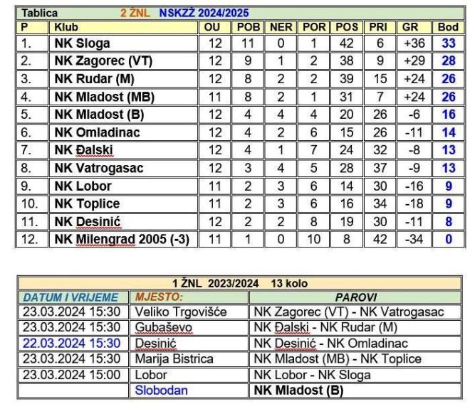 U 2. zagorskoj nogometnoj ligi na rasporedu je 13. kolo. Vodeća Sloga će opet na gostovanje i to kod Lobora, Zagorec VT dočekuje Vatrogasac, a Rudar M gostuje kod Đalskog. U natjecanje se uključuje i Mladost MB, koja dočekuje Toplice. Sastaju se još Desinić i Omladinac, a slobodna je Mladost B. Utakmica u Desiniću igra se danas, a ostale sutra u 15.30 sati, osim one u Mariji Bistrici koja počinje u 16 sati.