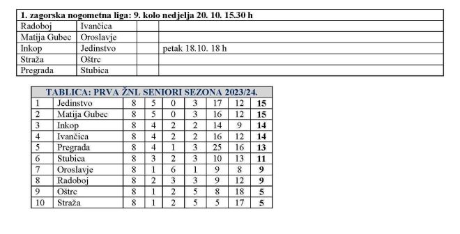 Četiri utakmice igraju se u nedjelju, no već sutra se igra derbi u Poznanovcu, gdje Inkop dočekuje Jedinstvo. Riječ je o utakmici koja može odlučiti o vodećoj ekipi na trećini prvenstva, ali i ne mora. Naime, Jedinstvo vodi sa 15 bodova, koliko ima i Matija Gubec, a Inkop ima samo bod manje, baš kao i Ivančica, dok je peta Pregrada sa 13 bodova.