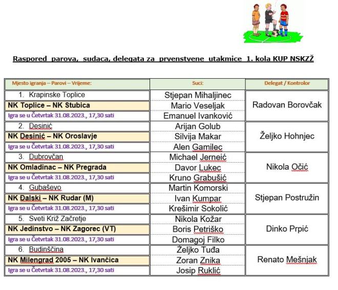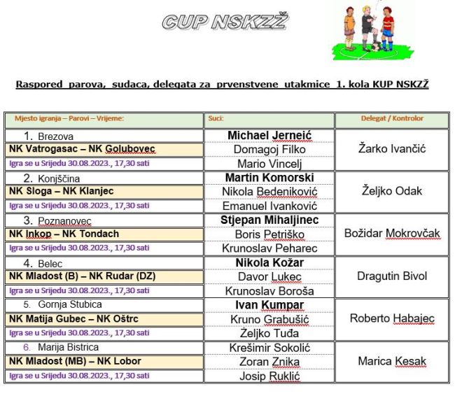 Na početku nogometne sezone u Zagorju kreće i kup natjecanje. Podsjetimo naslov brani Zagorec iz Krapine, koji se priključuje u 2. kolu, baš kao i Gaj Mače i Straža. A gotovo sve utakmice prvog kola igraju se danas i sutra. Jedino će Radoboj i Mladost Zabok igrati 6. rujna u 17.30 sati. Kao jedna od zanimljivijih parova prvog kola svakako je općinski derbi Bedekovčine. Naime, Inkop će u Poznanovcu dočekati Tondach, koji je pobjedom krenuo u 3. NL centar, a i ovdje je favorit. No, znamo da je kup natjecanje u kojem uvijek ima iznenađenja. Ova se utakmica igra u srijedu 30. kolovoza, kao i utakmice: Vatrogasac – Golubovec, Sloga – Klanjec, Mladost Belec – Rudar DZ, Matija Gubec – Oštrc i Mladost MB – Lobor. U četvrtak 31. kolovoza na rasporedu je još šest utakmica. Igrat će tako dva zagorska drugoligaša Đalski i Rudar M, te dva prvoligaša Jedinstvo i Zagorec VT. Toplice će dočekati Stubicu, Desinić je domaćin Oroslavju, a još se sastaju: Omladinac – Pregrada i Milengrad 2005. Ivančica. Sve su utakmice planirane u 17.30 sati.