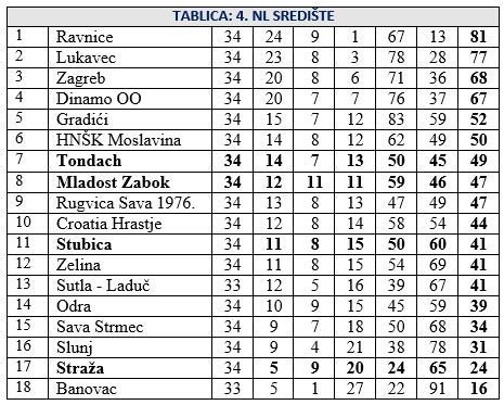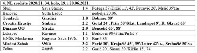 Jučer je na rasporedu bilo 8 utakmica posljednjeg 34. kola 4. NL središte. Igrali su i svi zagorski predstavnici. Tondach je slavio sa 1:0 protiv Gradića golom Bobinca u 80. minuti i na kraju stigao do 7. mjesta sa 49 bodova. Mladost Zabok je pobijedila 3:2 Odru uz dva gola Krajačića i jedan Pavića. Tim je Mladost na koncu završila na 8. mjestu sa 47 bodova. Stubica je odigrala kod Croatie Hrastje 2:2 i drži 11. mjesto sa 41 bodom, s tim da ju može preskočiti Sutla Laduč, koja igra još zadnje kolo kod zadnjeg Banovca. Stubicu je u vodstvo doveo Mateo Landripet, Croatia je preko Gotala i Pižira preokrenula, a R. Glavač je zabio za konačnih 2:2. Straža je poražena kod Dinama OO sa 0:2 i završila je sezonu na predzadnjem mjestu sa 24 boda. U derbiju kola Lukavec i Ravnice odigrali su 1:1, no već prije Ravnice su osigurale 1., a Lukavec 2. mjesto. Danas još igrahu Banovac i Sutla Laduč. Donosimo sve subotnje rezultate, strijelce i ljestvicu.