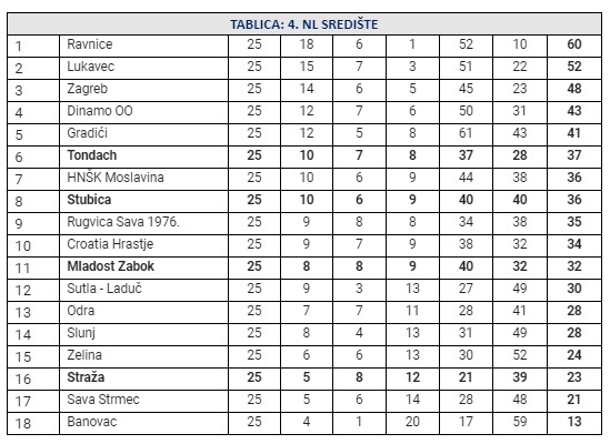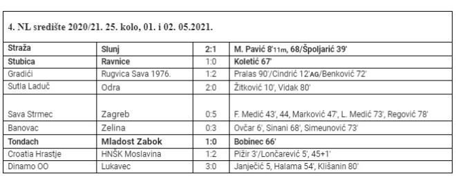 Uz današnju fantastičnu pobjedu Stubice, koja je u 25. kolu 4. NL središte nanijela prvi poraz vodećim Ravnicama, odigrane su još tri utakmice. Zagreb je kao gost sa 5:0 pobijedio Savu Strmec, i time pomogao Straži da jučerašnja pobjeda dobije potvrdu i preskakanje Save Strmec. Rugvica je također slavila kao gost, 2:1 kod Gradića, baš kao i Moslavina kod Croatie Hrastje, što je pak pomoglo da Tondach zadrži 6. mjesto. Stubica je nakon ovog kola na 8. mjestu, a Mladost iz Zaboka na 11. U 26. kolu Mladost ima priliku za pobjedu, jer dočekuje zadnji Banovac, dok će preostale tri zagorske ekipe u goste. Straža će na teško gostovanje kod vodećih Ravnica, Tondach gostuje kod Moslavine, a Stubica kod Rugvice. Evo svih rezultata ovog kola, strijelaca te trenutne ljestvice.
