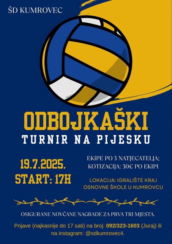 Osigurane su novčane nagrade za prva tri mjesta! Dođite, pokažite svoje odbojkaško umijeće i uživajte u sportskom druženju, natjecateljskoj atmosferi i dobroj zabavi! Vidimo se u Kumrovcu, 19.07.2025. s početkom u 17,00 sati, poručuju organizatori.