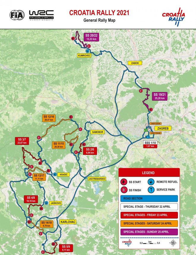 Sam rally imat će 20 brzinskih ispita u dužini preko 300 kilometara, točnije 302 kilometara, a počet će u četvrtak 22. travnja ceremonijalnim startom kod zagrebačkih Fontana u 19,45 sati. Prvobitno je bio predviđen brzinac u jednom od paviljona na zagrebačkom velesajmu, što bi bio prvi brzinac u zatvorenom u WRC-u, no od toga se odustalo iz razloga što zbog epidemiološke situacije vezane uz pandemiju korona virusa gledatelji ga ne bi mogli pratiti.
