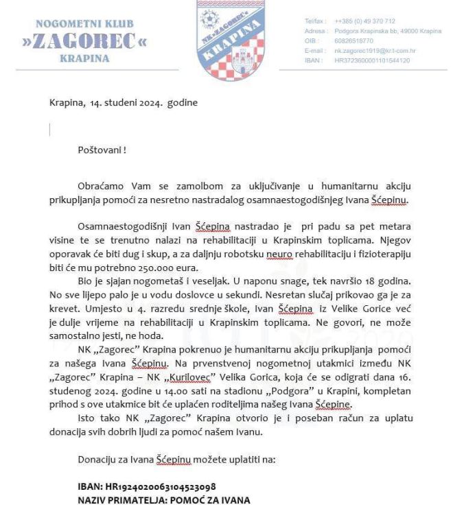 Ta utakmica, podsjećamo ima i humanitarni karakter, zahvaljujući hvale sjajnoj ideji Zagorca KR. Naime, sav prihod od ulaznica ići će za pomoć i liječenje Ivana Šćepine, nogometaša Kurilovca koji se već duže vrijeme nalazi na rehabilitaciji u Krapinskim Toplicama, nakon nesretnog i teškog pada na glavu.