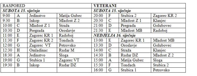 U organizaciji NK Stubice slijedeća dva vikenda na rasporedu je Zimski kup u malom nogometu za registrirane klubove KZŽ pod pokroviteljstvom NSKZŽ-e. Turnir će se igrati u prvom dijelu od petka do nedjelje (14. – 16. siječnja), a završnica je na rasporedu vikend nakon toga (20. - 22. siječnja). U veteranskoj kategoriji prijavilo su se 23 ekipe, s tim da Zagorec KT, Mladost Z i domaćin Stubica imaju prijavljene po dvije ekipe. Organizator je 23 ekipe rasporedio u 8 skupina, s tim da jedna skupina, malo neobično ima samo dvije ekipe. Kako će u osminu finala po dvije ekipe iz svake skupine, već sada možemo reći da će među 16 Rudar M i Omladinac koji se nalaze u skupini H. U skupini A su Jedinstvo, Matija Gubec i Sloga, u skupini B Inkop, Rudar DZ i Mladost Z 2, u skupini C Mladost Z 1, Klanjec i Straža, u skupni D Pregrada, Oroslavje i Golubovec, u skupini E Zagorec KR 1, Radoboj i Mladost MB, u skupini F Stubica 2, Zagorec KR 2 i Tondach, te u skupini G Stubica 1, Zagorec VT i Petrovsko. Inače, zbog COVID-a prošle godine nije bilo turnira, pa naslov iz 2020. brani Zagorec KR 2.